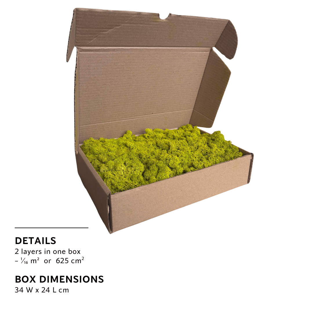 Add whimsical, branching drama to your designs with Reindeer Moss, real moss meticulously preserved for a soft, antler-like allure. Select from lime green, light green, olive green, or forest green; the compact box (34cm L x 24cm W) covers 625 square centimeters, packing punchy style into every project.